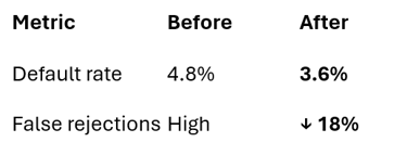 Fewer defaults: By catching hidden risk patterns (e.g., “low score + high utilization + multiple inquiries”), banks reduce bad loans.