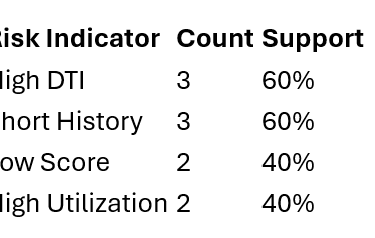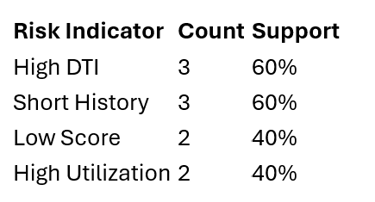 This step filters out noise, retaining only strong, repeated risk patterns. For example, if “short credit history + multiple inquiries” appears in 15% of defaults but only 2% of safe loans, it’s a red flag.