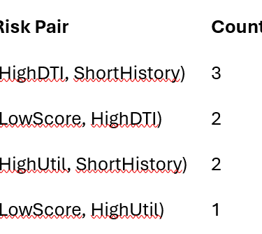 Count frequent single risk indicators (e.g., 40% of defaults include “high DTI”).