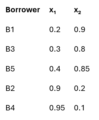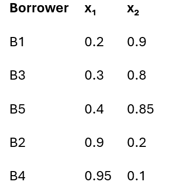 Each borrower is a point in a high-dimensional space, where key metrics like: x=(x1,x2), where: