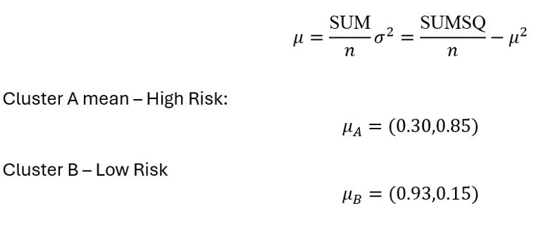 BFR maintains cluster summaries (COUNT, SUM, SUMSQ) instead of storing raw data, reducing memory use by 90%. The result? Stable borrower archetypes like: